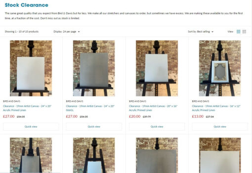 Bird & Davis Stock Clearance offers artists the opportunity to purchase high-quality stretchers and canvases at reduced prices, without compromising on craftsmanship. Known for producing made-to-order stretchers and canvases to exacting standards, Bird & Davis occasionally has excess stock, which is now being made available to customers for the first time at a fraction of the usual cost.